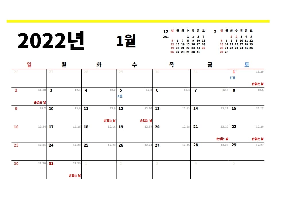 음력, 손없는날이 표시된 2022년 달력 프린트 파일 다운로드 공유 합니다. 2022년은 임인(壬寅) 년 검은 호랑이의 해입니다. 매년 달력 자료들을 pdf, xls 파일로 만들고 있는데 2022년은 2021년보다 쉬는날이 조금 늘어나서 시작부터 기분이 좋습니다. 엑셀, PDF로 제작했기 때문에 수정이 필요하신 분들은 엑셀파일을.. 그냥 프린트 출력을 하고 싶으신 분들은 PDF 파일로 다운로드 받으시면 됩니다.