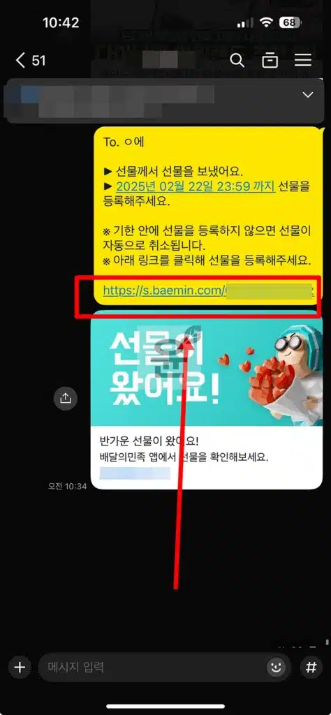 선물은 보통 카카오톡이나 문자로 받게 되는데 여기서 잘 보면 링크가 있습니다. 클릭해주세요.