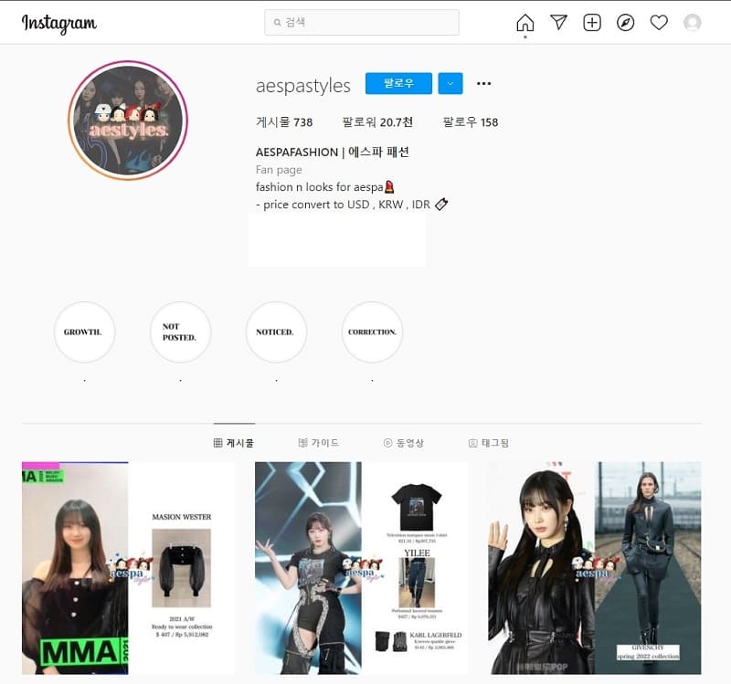 예를 들어 요즘 핫한 에스파로 찾아보면 “aespastyle”으로 검색하게 되면 정말 많은 정보들을 쉽게 찾을수가 있겠네요.