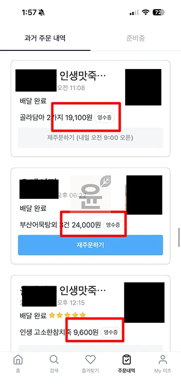 3. 주문내역 화면에서 과거 주문 내역이 나오는데 기본적으로 최신 주문부터 보여주기 때문에 필요하면 과거 내역까지 스크롤해서 주문 금액을 계산을 해볼 수가 있습니다.