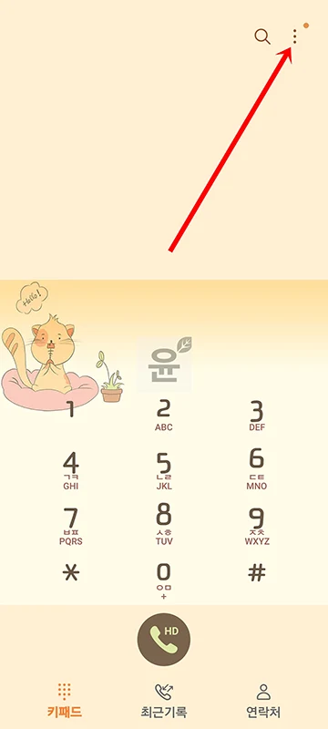 2. 전화 앱 화면에서 오른쪽 위에 ⁝ 아이콘을 클릭 후 설정 메뉴를 선택합니다.