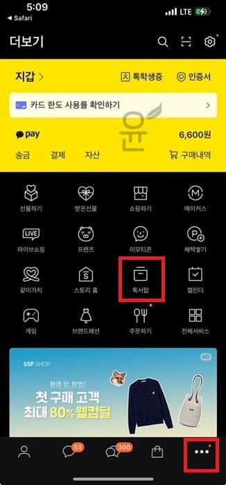 카카오톡 메인에서 더보기 버튼을 클릭합니다. 그리고 더보기 화면에서 톡서랍 메뉴를 클릭합니다.