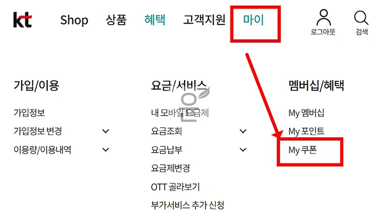 KT 홈페이지 메인에서 상단에 보이는 마이를 클릭하고 멤버십/혜택 아래에 보이는 My 쿠폰 메뉴를 클릭 합니다.
