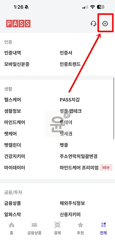 2. PASS 앱 메인에서 전체를 선택 후 오른쪽 상단에 설정을 클릭합니다.