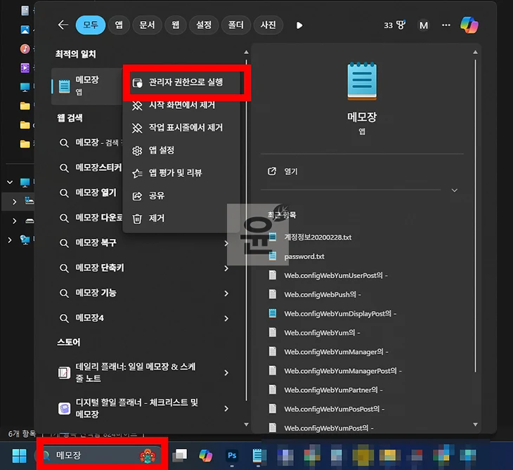 1. 먼저 시작 표시 옆에 메모장으로 입력하고 메모장 앱 위에 마우스 오른쪽 키를 눌러 관리자 권한으로 실행을 클릭해서 열어줍니다.