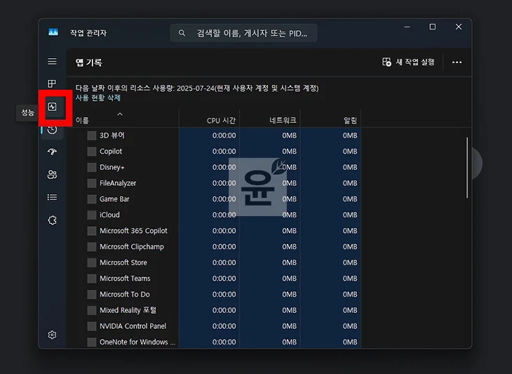 2. 그리고 나서 성능 탭을 눌러주세요.