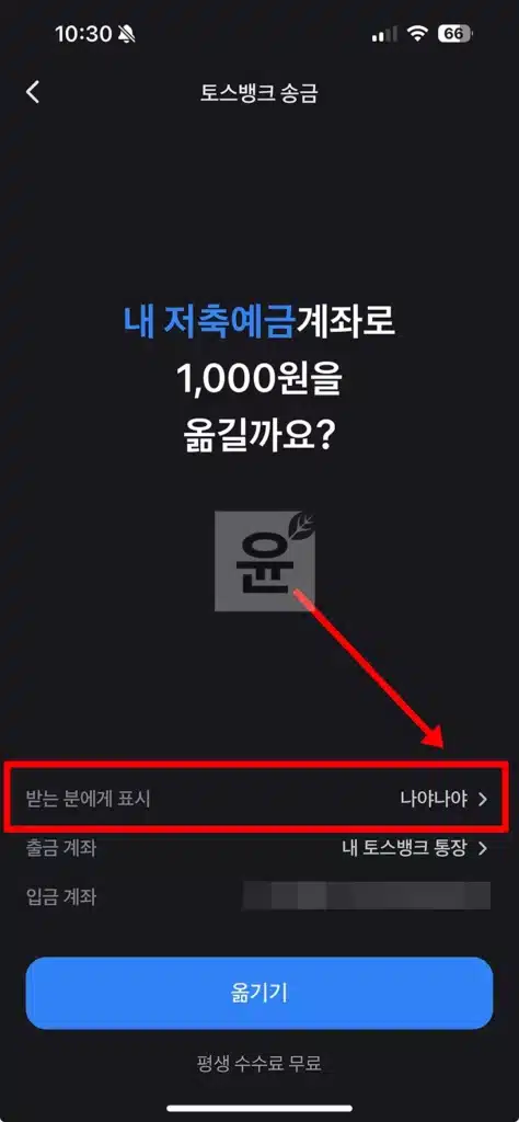 금액을 입력하게 되면 송금 금액, 받는 분에게 표시(입금자명), 출금 계좌, 입금계좌를 확인할 수가 있습니다. 여기에서 옮기기 전에 받는 분에게 표시(송금 입금자명)를 클릭합니다.