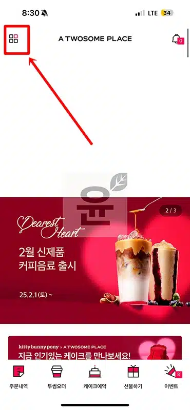 1. 투썸하트 앱을 실행하고 투썸 오더 메뉴로 들어갑니다.