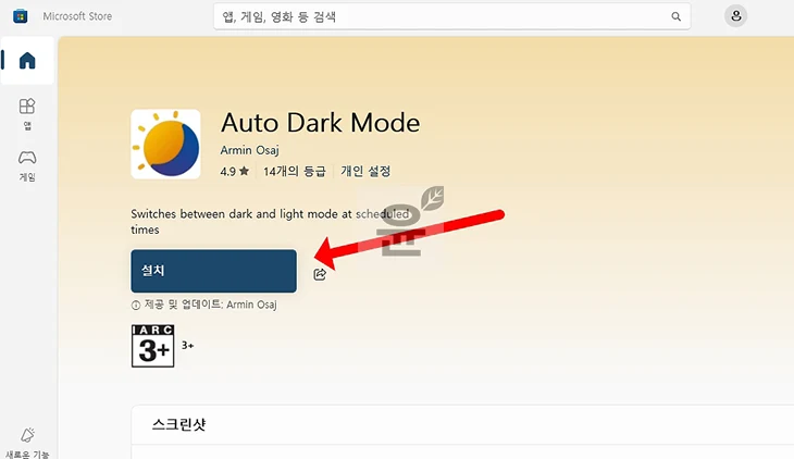 1. 마이크로소프트에서 Auto Dark Mode로 검색 후 설치를 합니다. 설치 버튼을 누르면 쉽게 다운로드 후 설치가 가능합니다